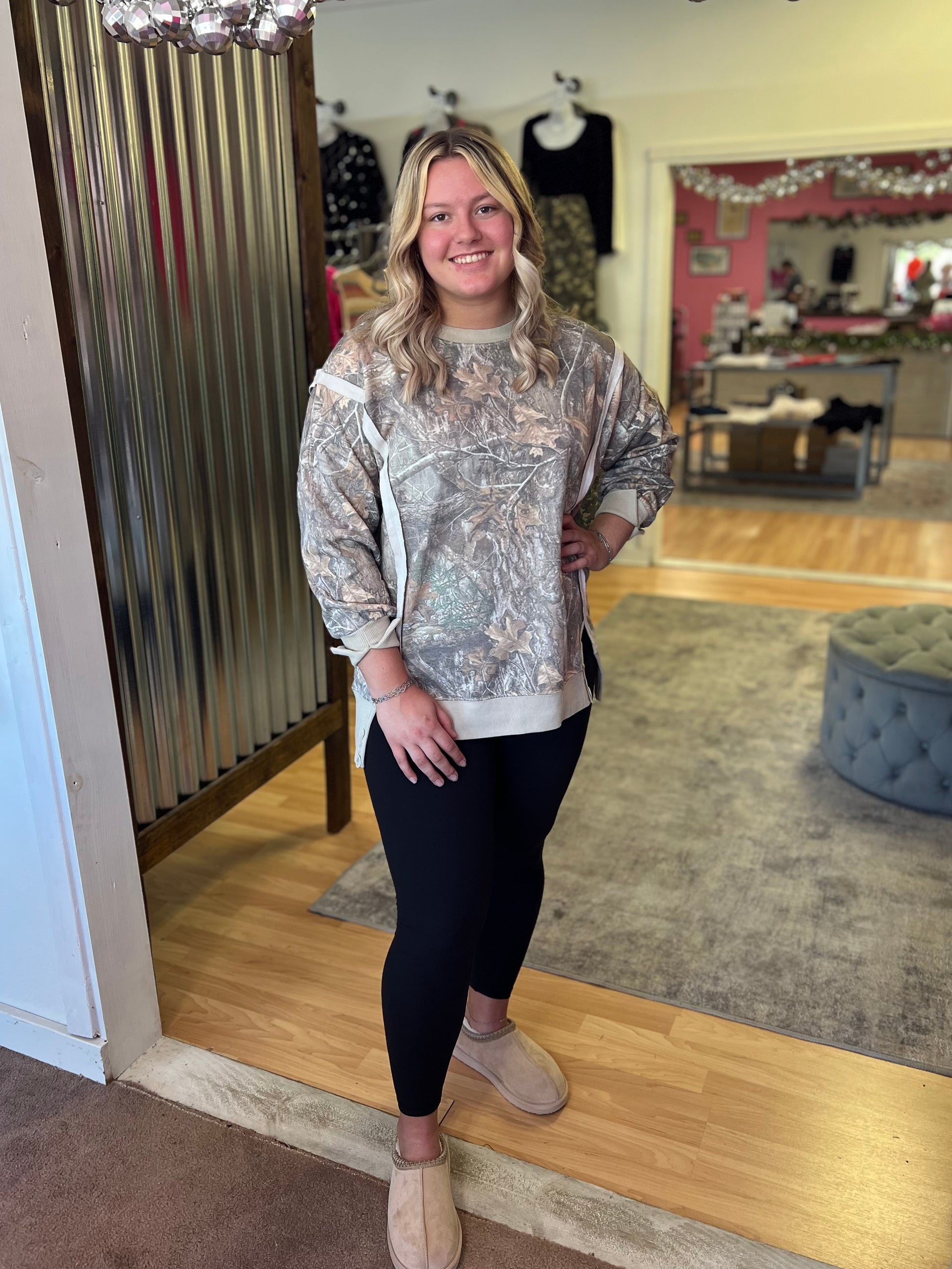 This cozy camo pullover features a relaxed fit with exposed seams, split cuffs, and ribbed trim. It’s super soft inside for all-day comfort and has dropped shoulders and a scoop neckline for a laid-back look.