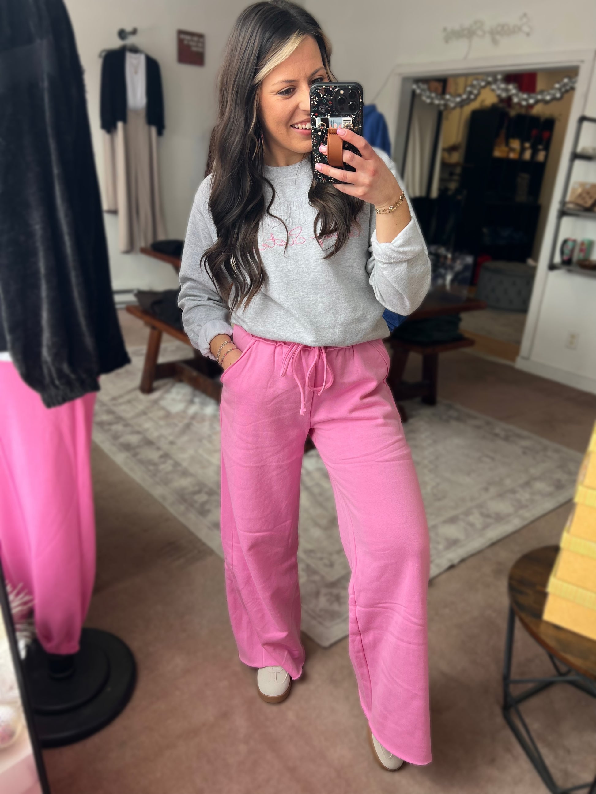 Soft fleece sweatpants with a relaxed wide leg fit, adjustable drawstring waist, and fun exposed seam detail.