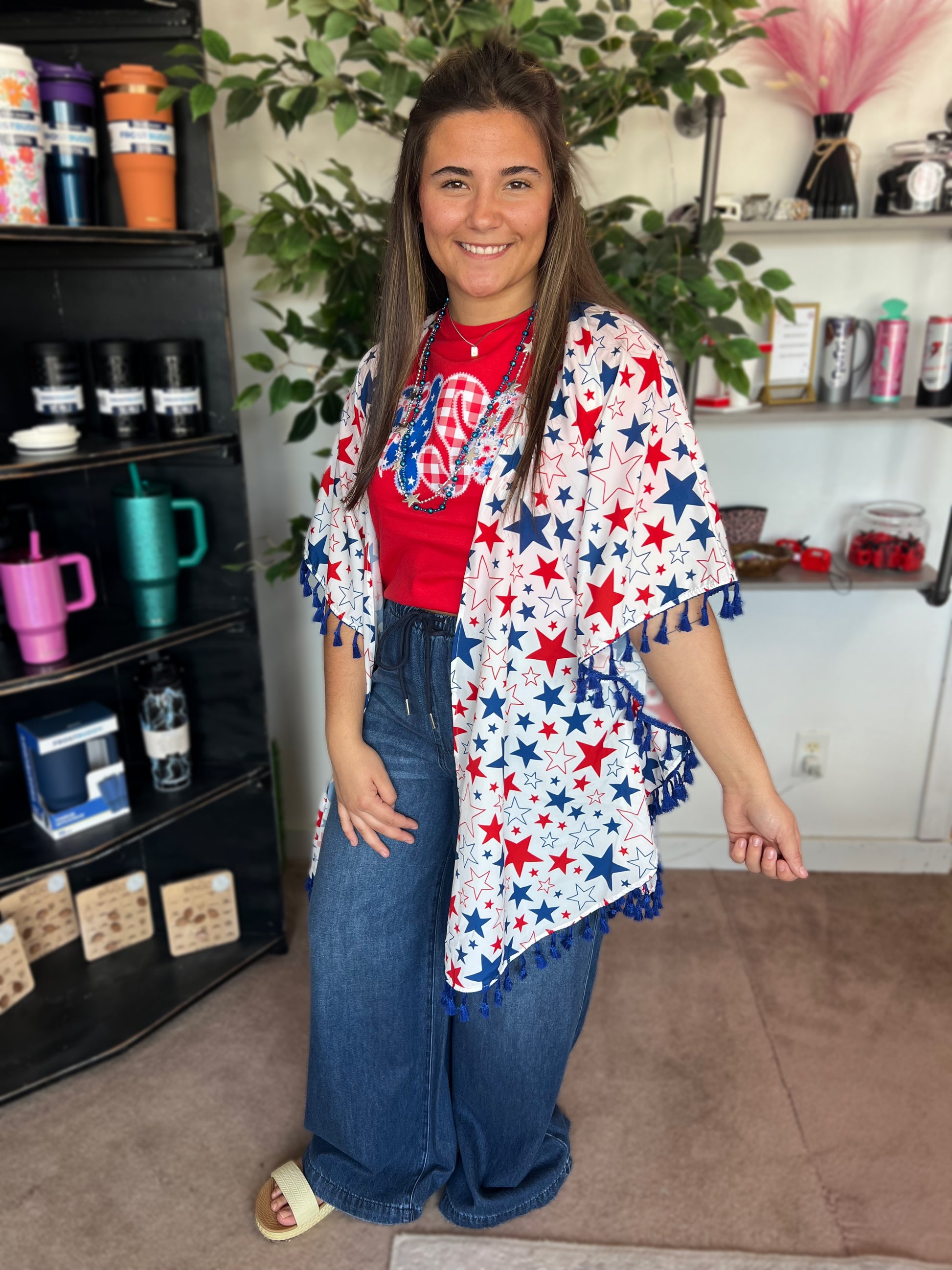 Faux stitch design on a beautiful red colored tee. Gingham bow with a star, gingham and floral print mix wording.