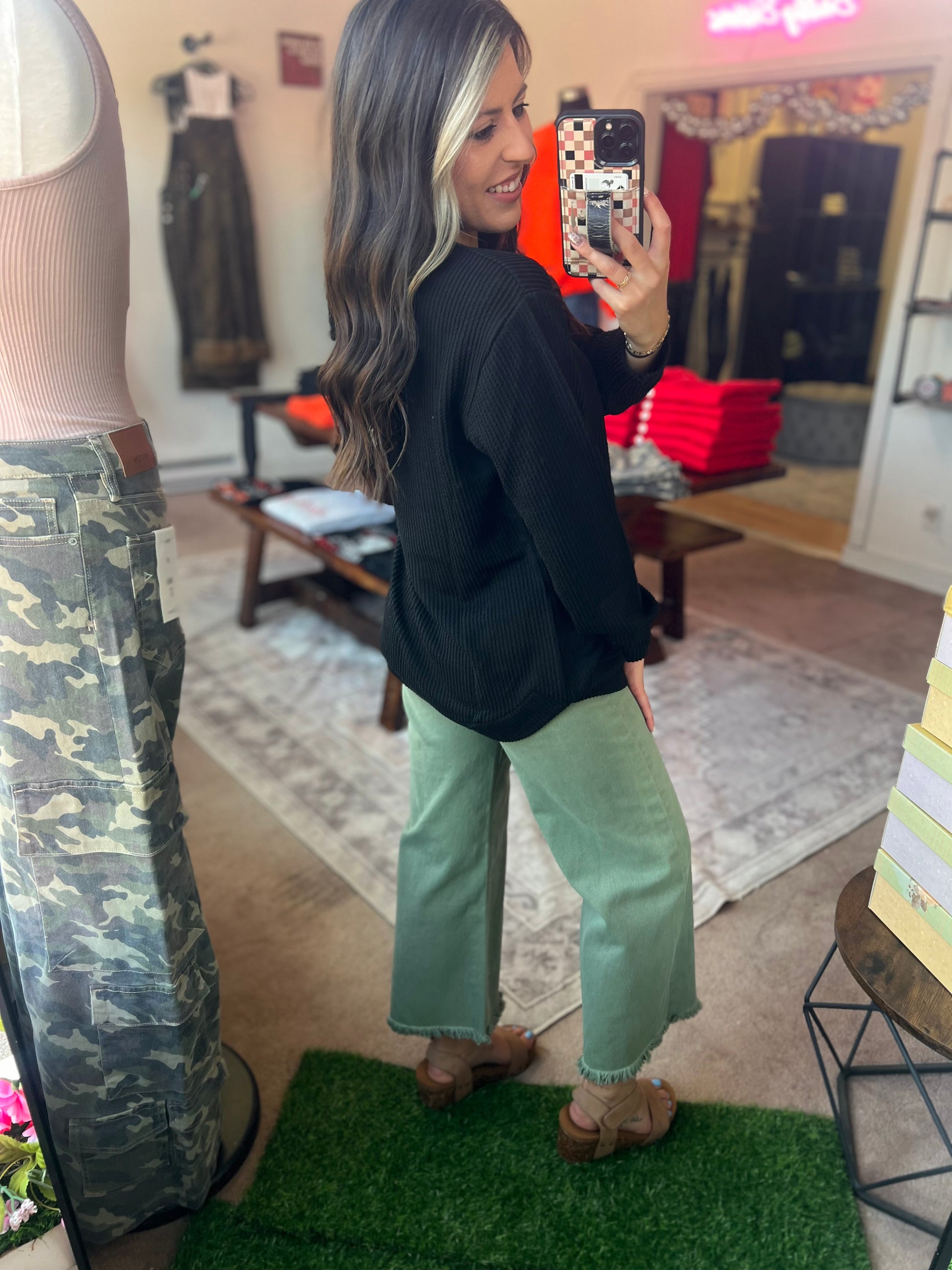 This top features a round neck and long sleeves, made from soft, stretchy raised rib fabric. It has a relaxed fit and a curved hemline for a comfortable and stylish look.