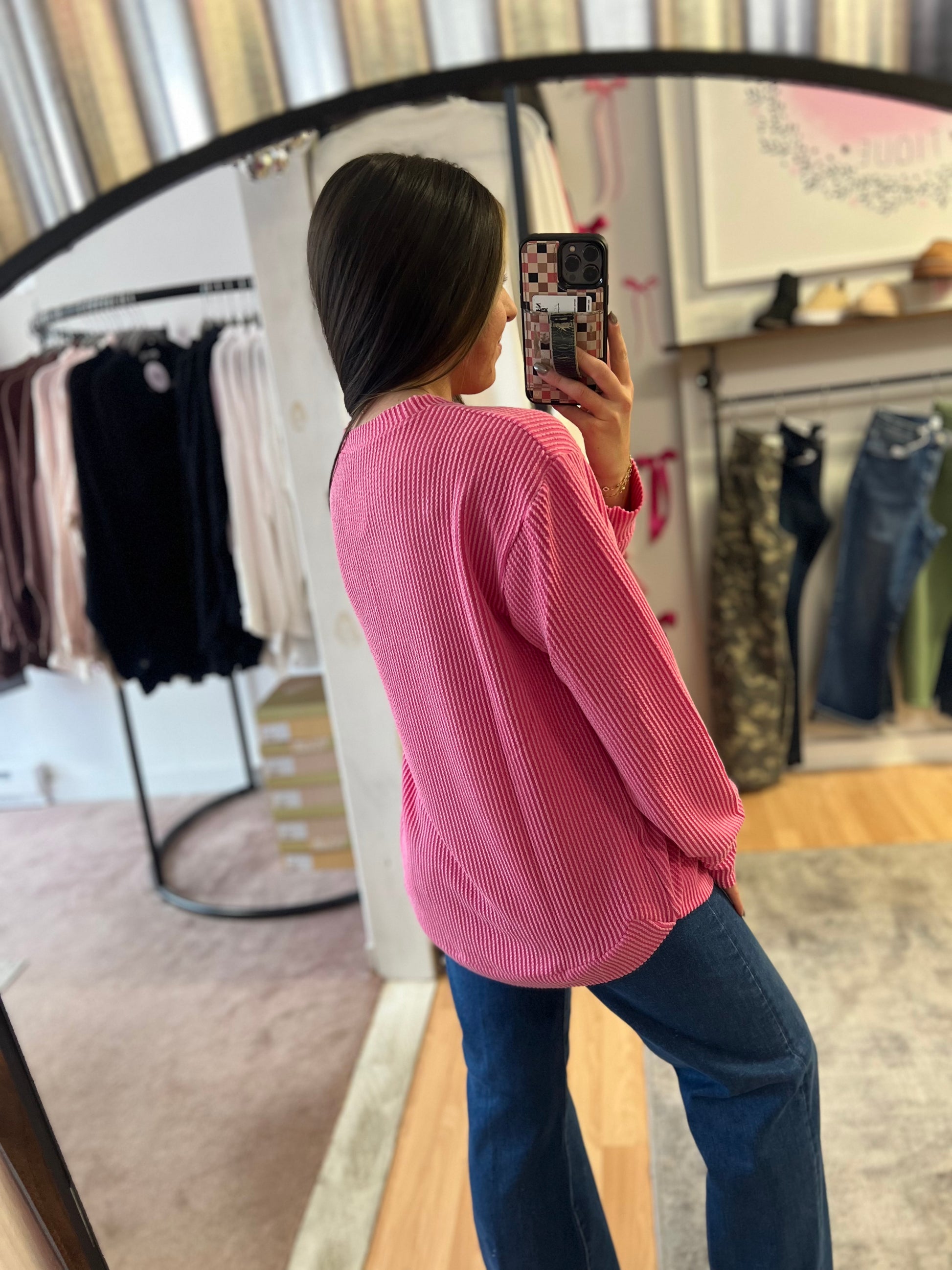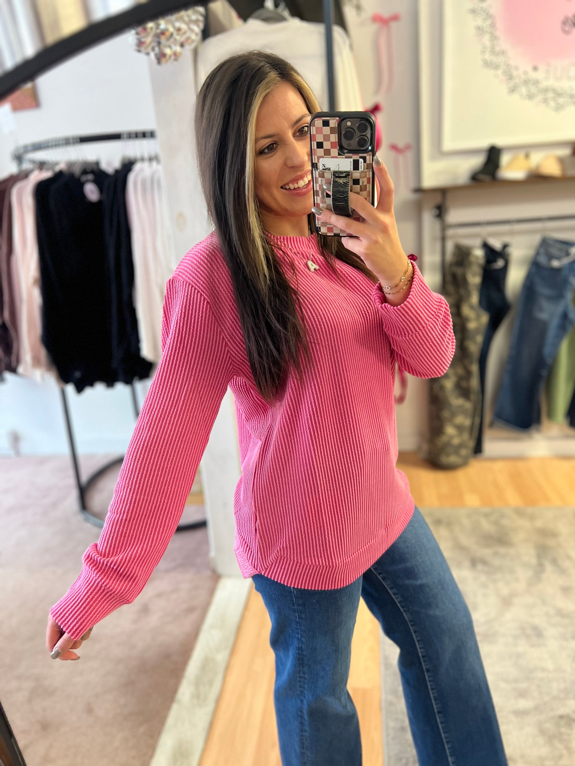 This top features a round neck and long sleeves, made from soft, stretchy raised rib fabric. It has a relaxed fit and a curved hemline for a comfortable and stylish look.