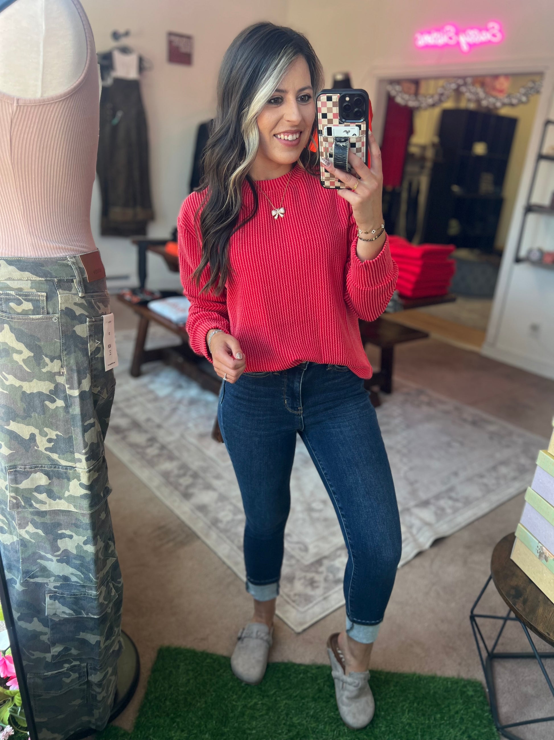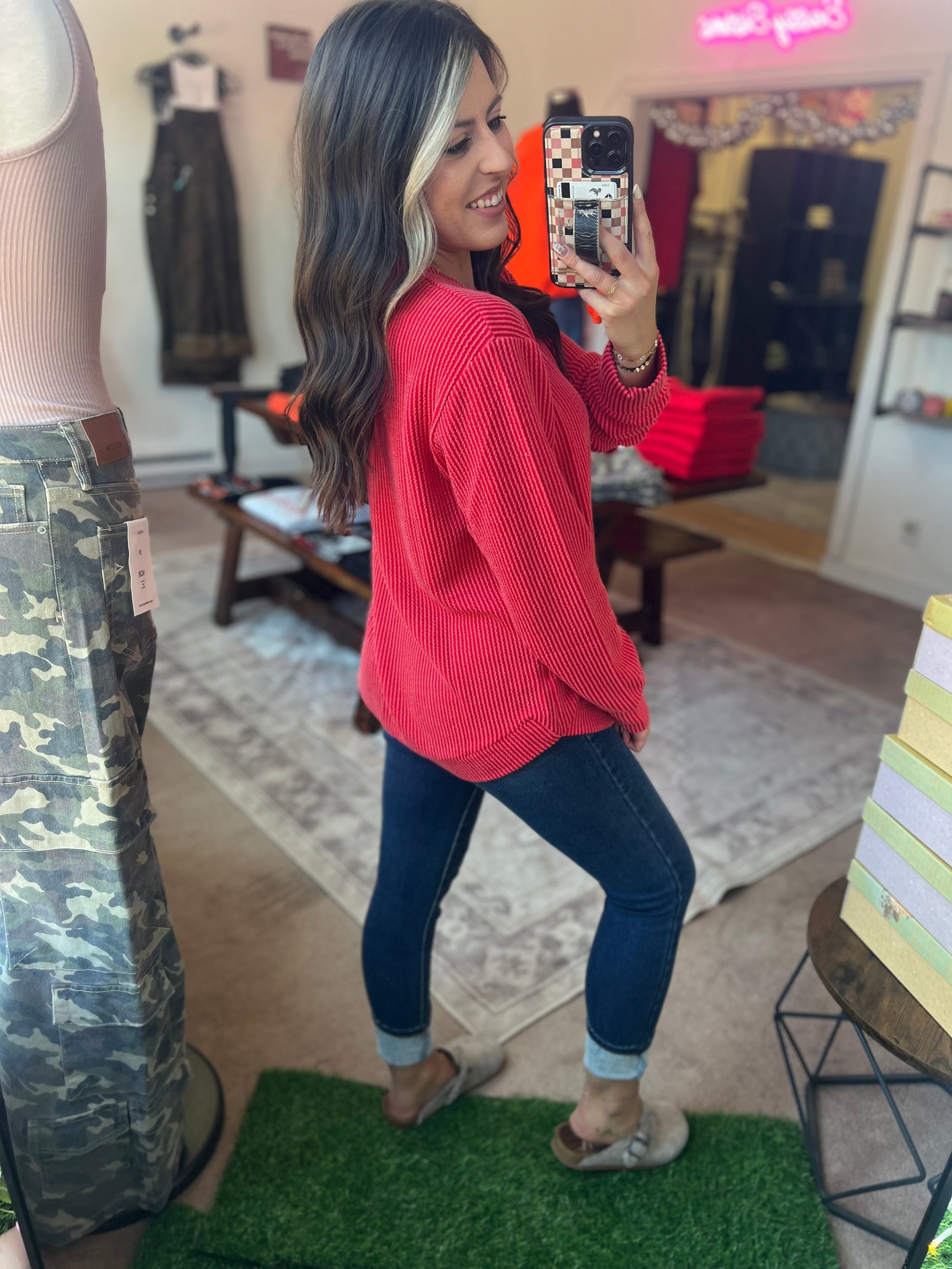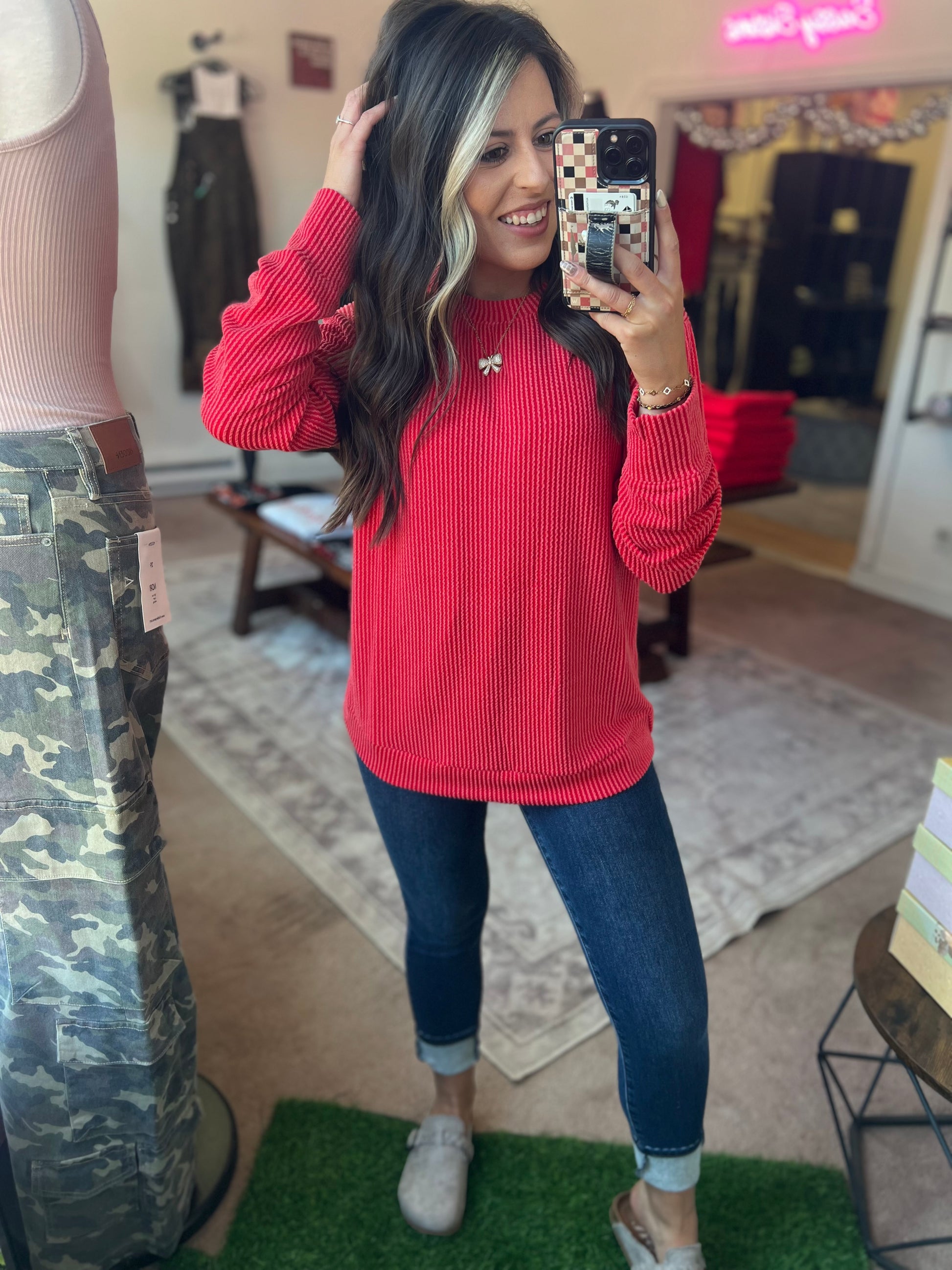 This top features a round neck and long sleeves, made from soft, stretchy raised rib fabric. It has a relaxed fit and a curved hemline for a comfortable and stylish look.